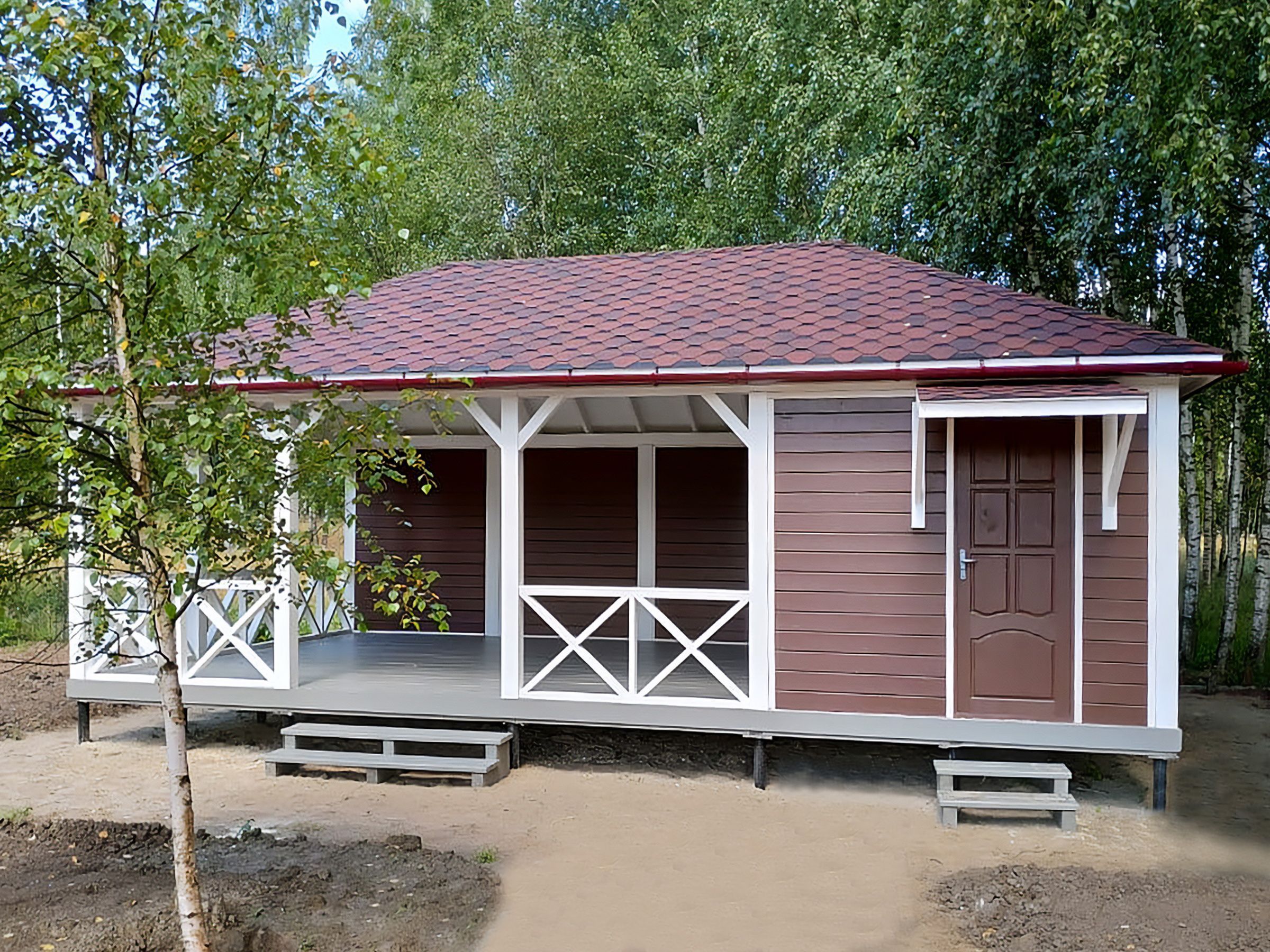 Изделия из клееного бруса предлагаются в трёх комплектациях: «несущий каркас», «базовая» и «премиум». В последнем случае стойки выполнены не из цельного массива дерева, а из клеёного бруса, а обрешётка кровли – из имитации бруса с замковым соединением.
